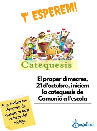 La catequesi la dirigeixen membres de la nostra comunitat educativa, persones familiars i properes al nostre alumnat. Aquestes sessions es realitzen cada dimecres, de 17.15h a 18.30h als espais de l'escola seguint tote sles mesures de seguretat i prevenció establertes.